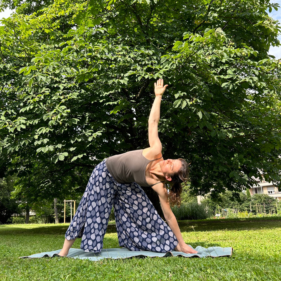 - Move into Triangle Pose to activate the muscles and improve blood flow.